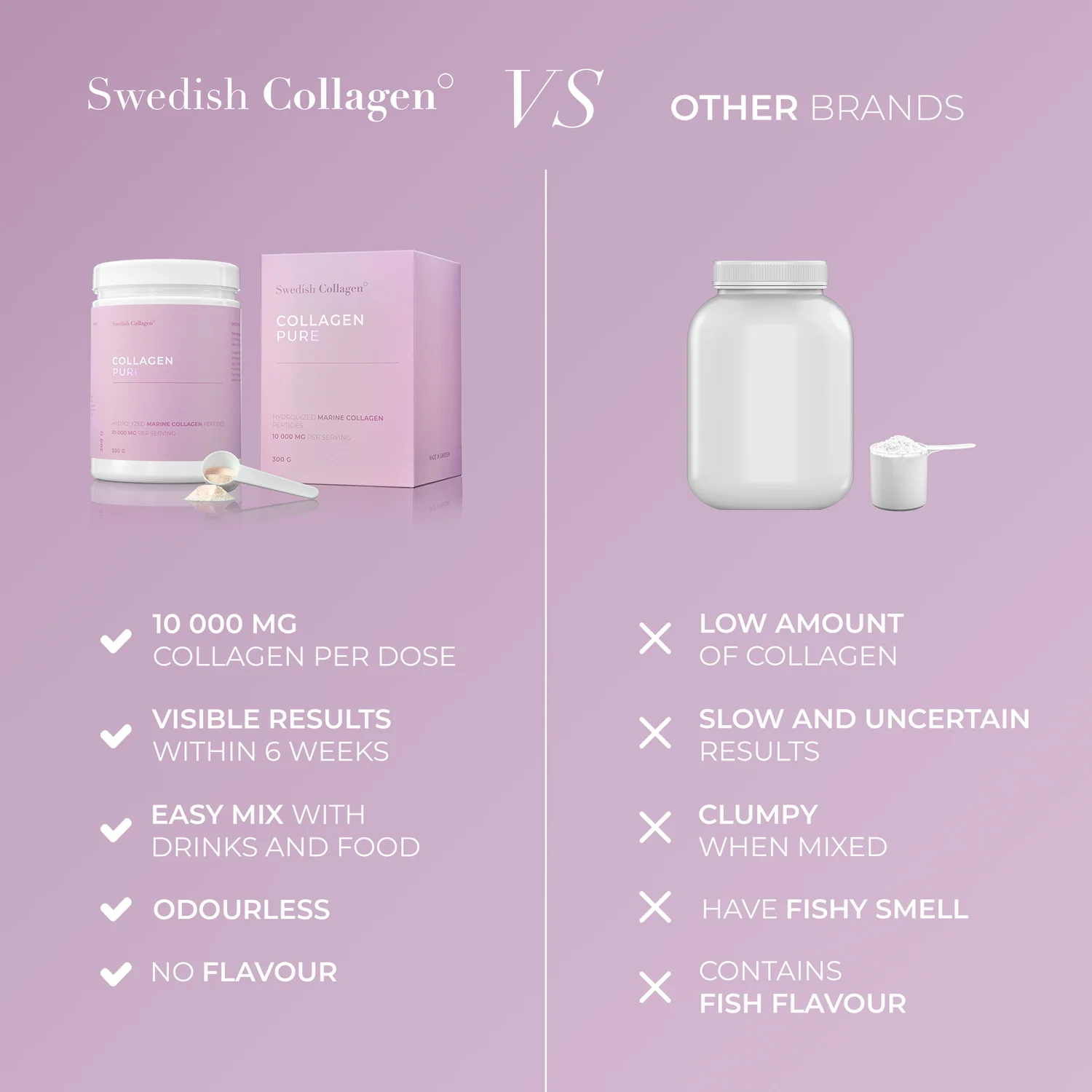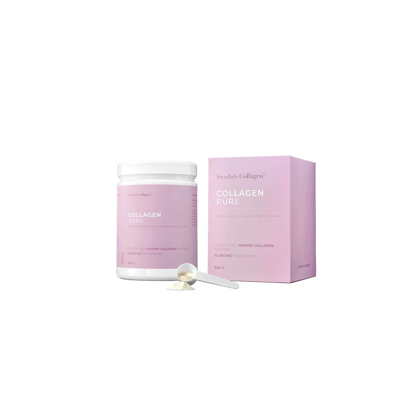 Swedish Collagen Pure is a high-quality collagen powder that consists of 100% hydrolyzed marine collagen. The hydrolysis process breaks down the collagen into small, tiny peptides. This process makes the collagen tasteless and odorless, which makes Collagen Pure powder easy to mix with any beverage.