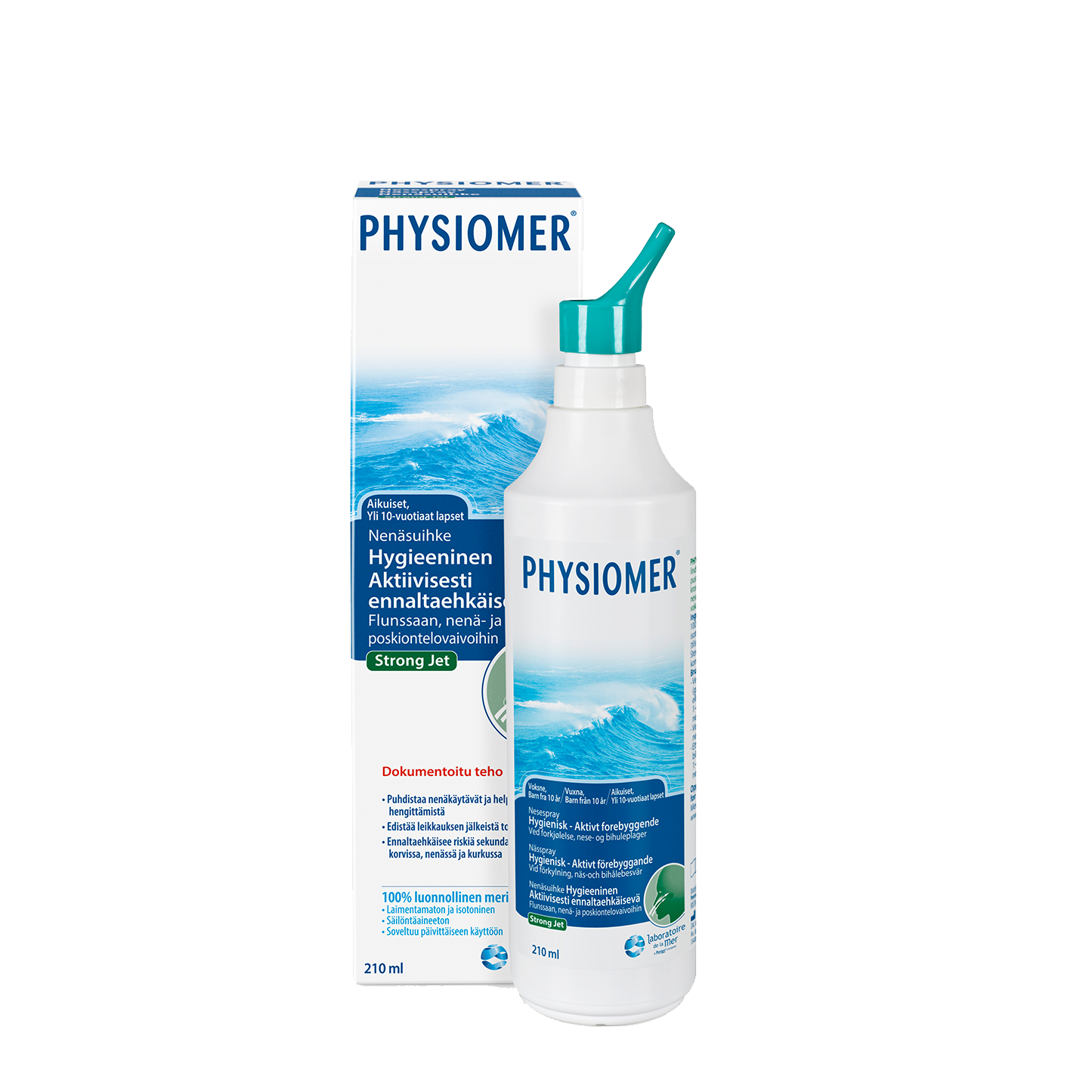 Physiomer Strong Jet har en stark stråle och är speciellt anpassad för kroniska symtom och används efter operationer i näsa och bihålor. Den starka strålen sköljer kraftfullt näsa och bihålor rena. Rengör näsgångarna och underlättar andningen. Återfuktar och återställer nässlemhinnan och förebygger sekundära infektioner i öron, näsa och hals.